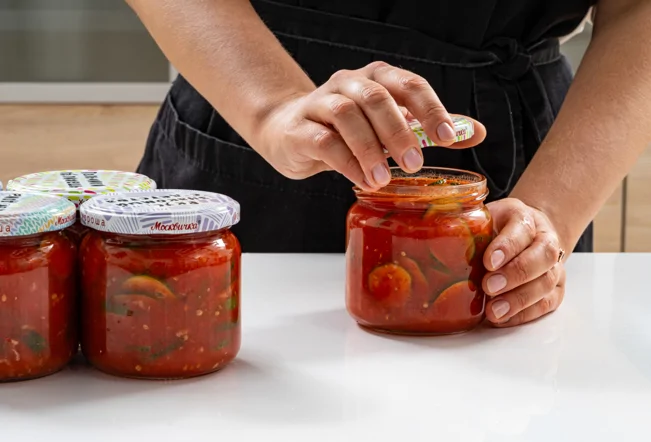 9. Horký salát dejte do sklenic, uzavřete víčka, otočte dnem vzhůru a nechte zcela vychladnout přikryté dekou.