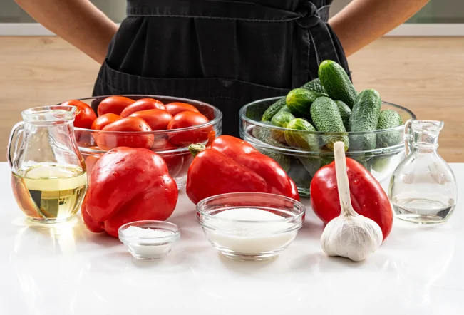 1. Připravte si všechny ingredience. Sterilizujte sklenice a víčka nad párou po dobu 20 minut.