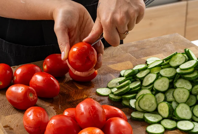 2. Okurky dobře omyjte, osušte a nakrájejte na kolečka. Slupku rajčat nařízněte napříč.