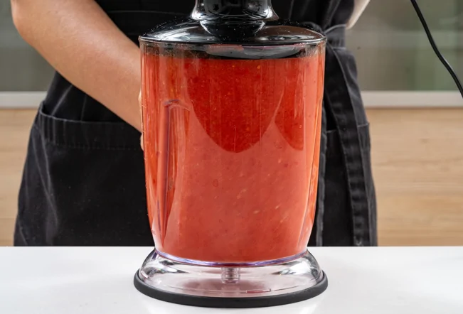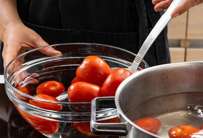 3. Rajčata blanšírujte ve vroucí vodě 30 sekund, poté je přendejte do studené vody a oloupejte.