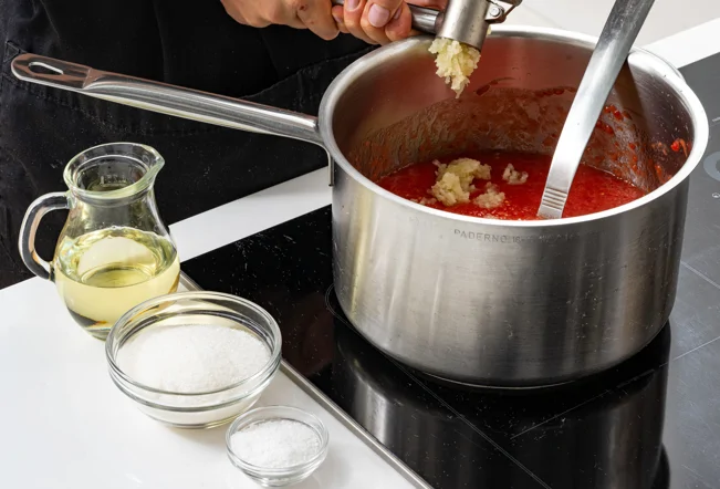 6. Rajčatový a paprikový protlak dejte do hrnce, přidejte sůl, cukr, rostlinný olej a prolisovaný česnek.