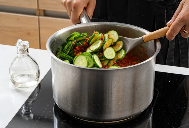 8. Přidejte okurky, znovu přiveďte k varu a vařte dalších 5 minut, také za stálého míchání. Na konci přidejte ocet.
