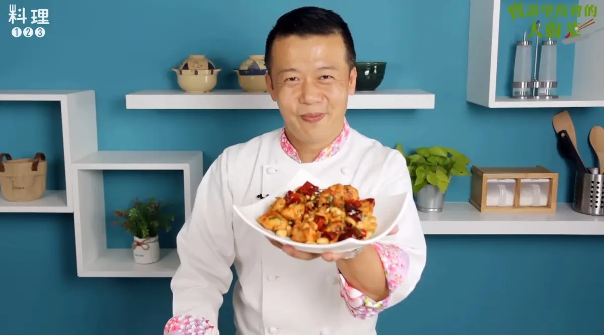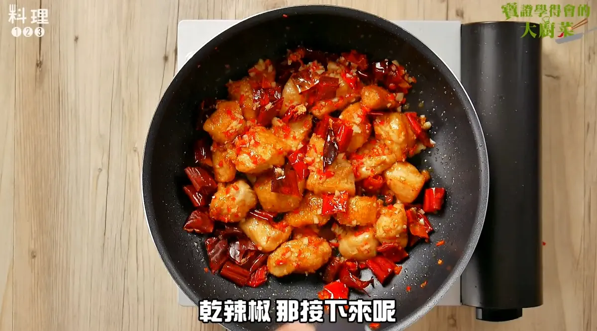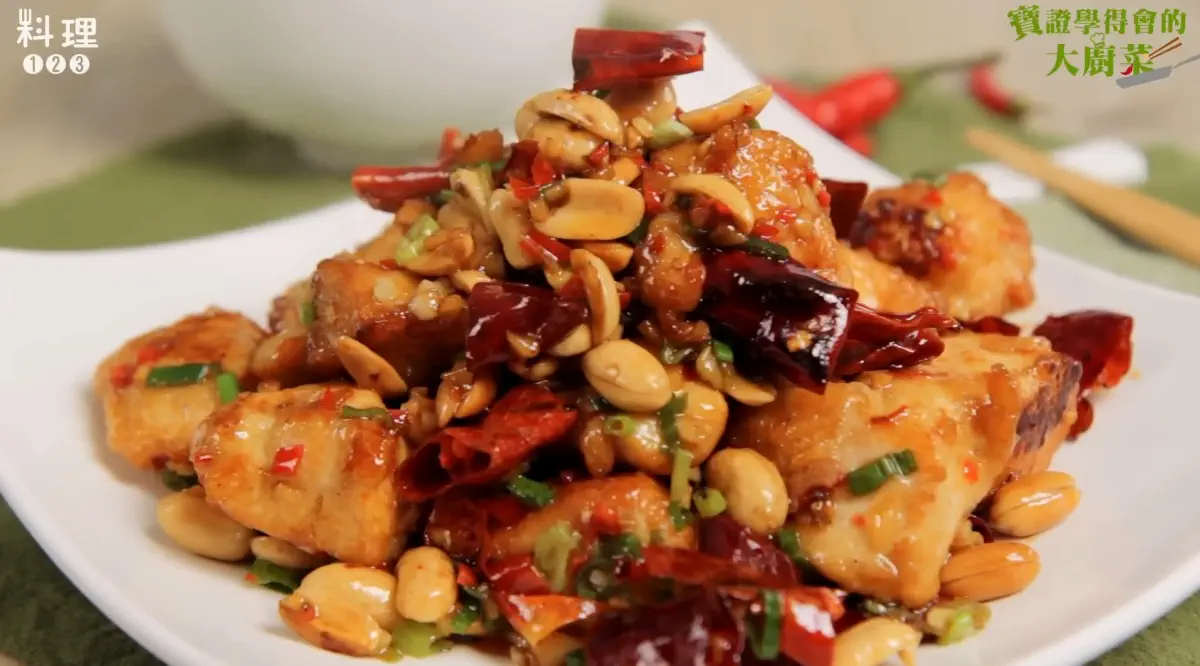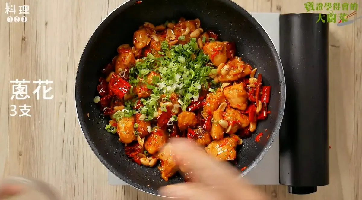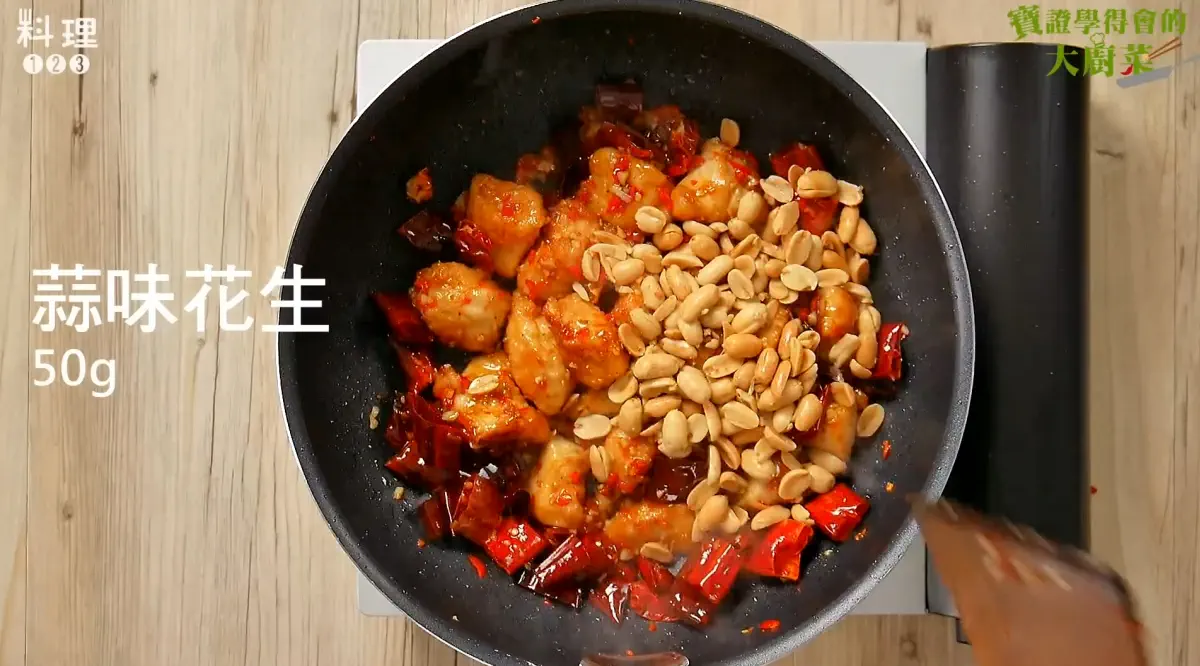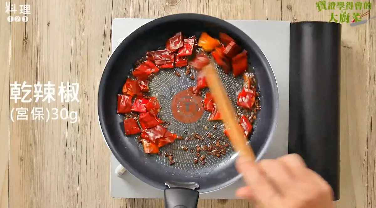 6. Nakonec přidejte sušené chilli papričky, odpovídající množství sójové omáčky, česnek, arašídy, zelenou část cibulky a veškeré koření, rovnoměrně orestujte na vysokém plameni a zahustěte ve vodě rozředěným škrobem.