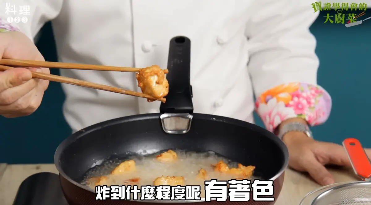 4. Nakrájené marinované kuře opékejte na oleji o teplotě 170–180 stupňů dozlatova, poté odeberte a ponechte na talířku.