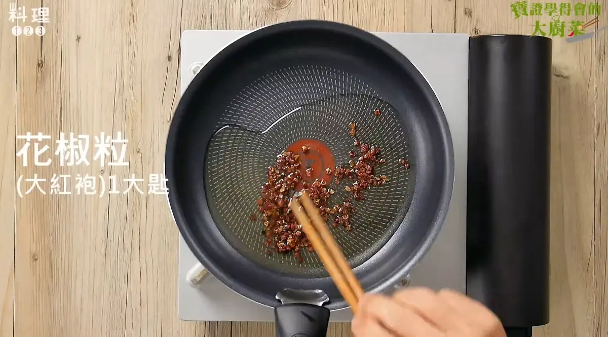 3. Pepřový olej: Do pánve dejte lžíci sezamového oleje, poté přidejte zrna sečuánského pepře a zahřívejte na mírném ohni asi tři minuty. Poté pepřová zrna vyjměte a nechte pouze pepřový olej.